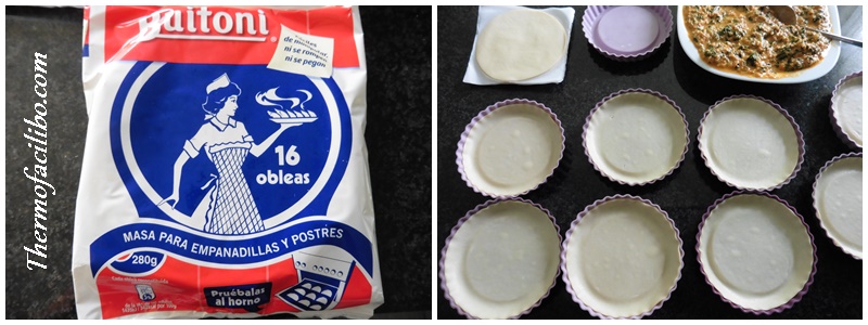- Pinzellar amb oli 11 cassoletes amb oli (les meves són de silicona d’12 cm de diàmetre). Col·locar sobre cada cassoleta una oblea. Prémer un xic l’oblea i repartir el farcit al damunt.