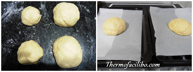 - Tapar-ho tot amb draps de cuina i deixar llevar durant una hora i mitja o dues fins a doblar el seu volum. A la meitat del procés, quan hagin llevat una mica, muntar els pans amb molt de compte que la massa no baixi. Per fer això, posar sobre cada bola gran, els cilindres (amb les formes que hem fet) en forma de creu i al damunt la bola petita. Tapar altre cop i deixar acabar de llevar.