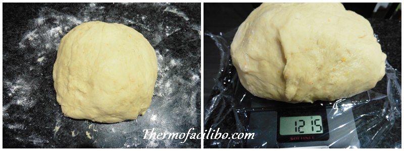 - Retirar la massa del got i col·locar-la sobre el taulell de cuina empolvorat amb farina. És una massa enganxifosa, si ens costa treballar-la, podem afegir una mica de farina, fins que la puguem treballar bé. Però compte no ens passem amb la farina, només n’afegirem una mica just per poder treballar la massa. (La meva massa pesava 1215 g)