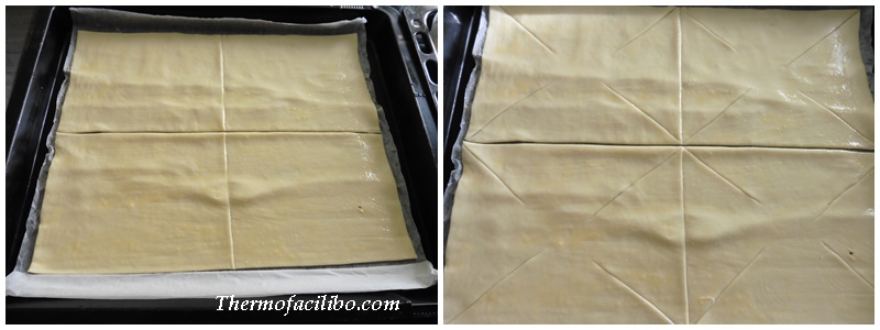- Col·locar cada làmina de pasta de full sobre una safata de forn i fer uns talls, amb un ganivet, des dels cantons cap al mig, però sense arribar al centre. Com es veu a la foto.