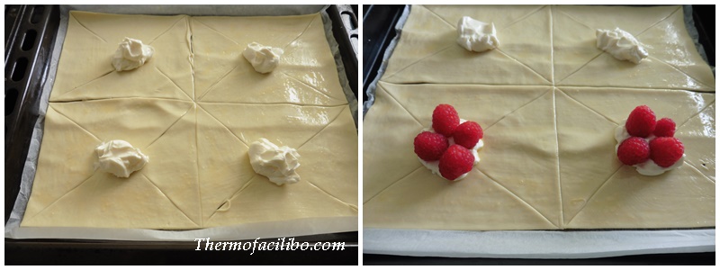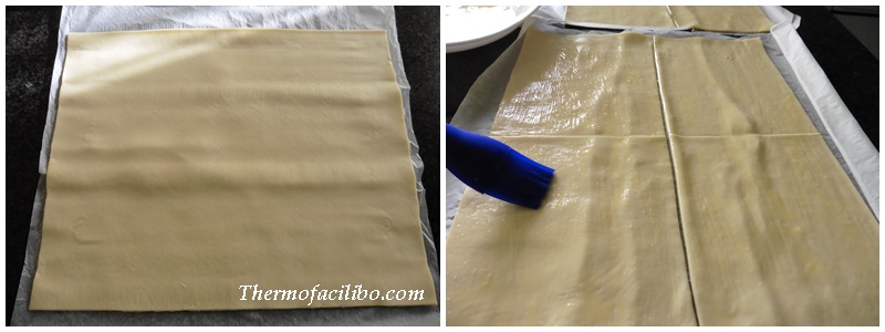 - Estirar les làmines de pasta de full sobre el paper en què vénen embolicades. Tallar cada làmina en 4 parts iguals i pintar amb ou batut.