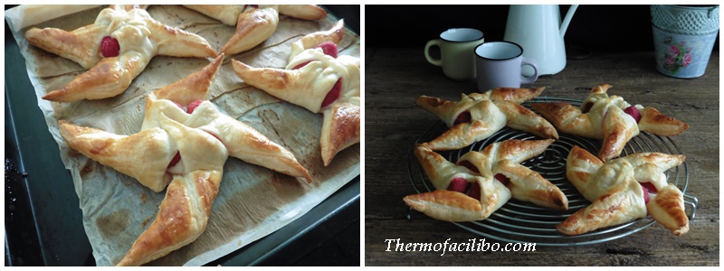 - Pinzellar amb ou batut i enfornar d’en una en una les safates durant 10-15 minuts a 200º o fins que la pasta de full sigui daurada.