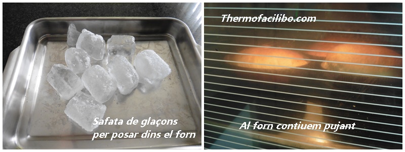 - Posar els glaçons de gel dins la safata refractaria que tenim a la base i immediatament introduir els panettones (col·locar els panettones en la guía del mig del forn).