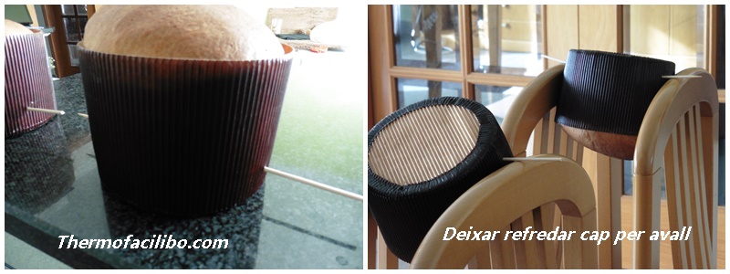 - Retirar del forn i amb una broqueta gran travessar-los a 2 cm de la base i recolzar la broqueta entre dues superfícies (jo els deixo entre cadires) perquè el panettone quedi penjat cap per avall. Deixar refredar d’aquesta manera.