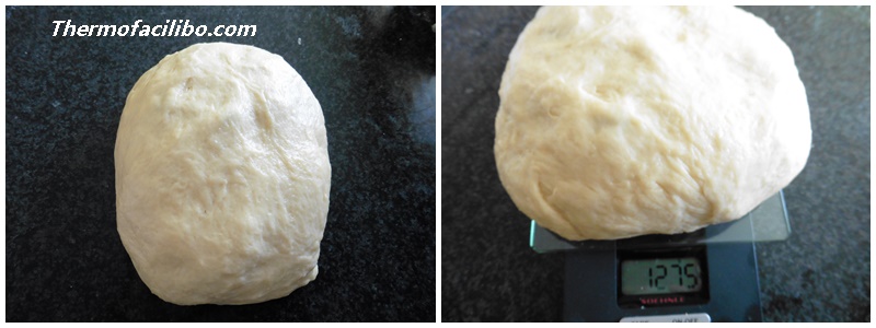 - Col·locar el bol amb la massa al damunt la tapa del got, prémer la tecla de la balança, i cobrir la massa amb els 180 g restans de farina.