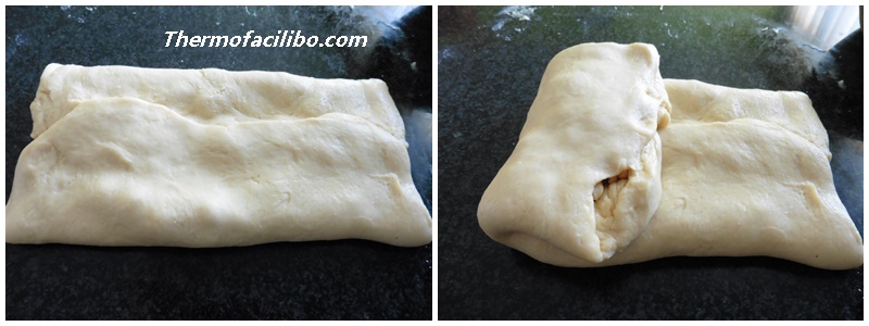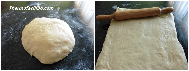 - Col·locar la massa en una superfície enfarinada pastar una mica amb les mans per desgasificar i formar un rectangle de 35 x 30 cm.