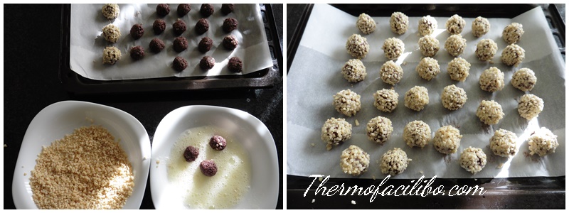 - Fer boles de 8 g cadascuna i col·locar-les en una safata de forn prèviament folrada amb paper vegetal. Reservar mínim 15 minuts a la nevera.