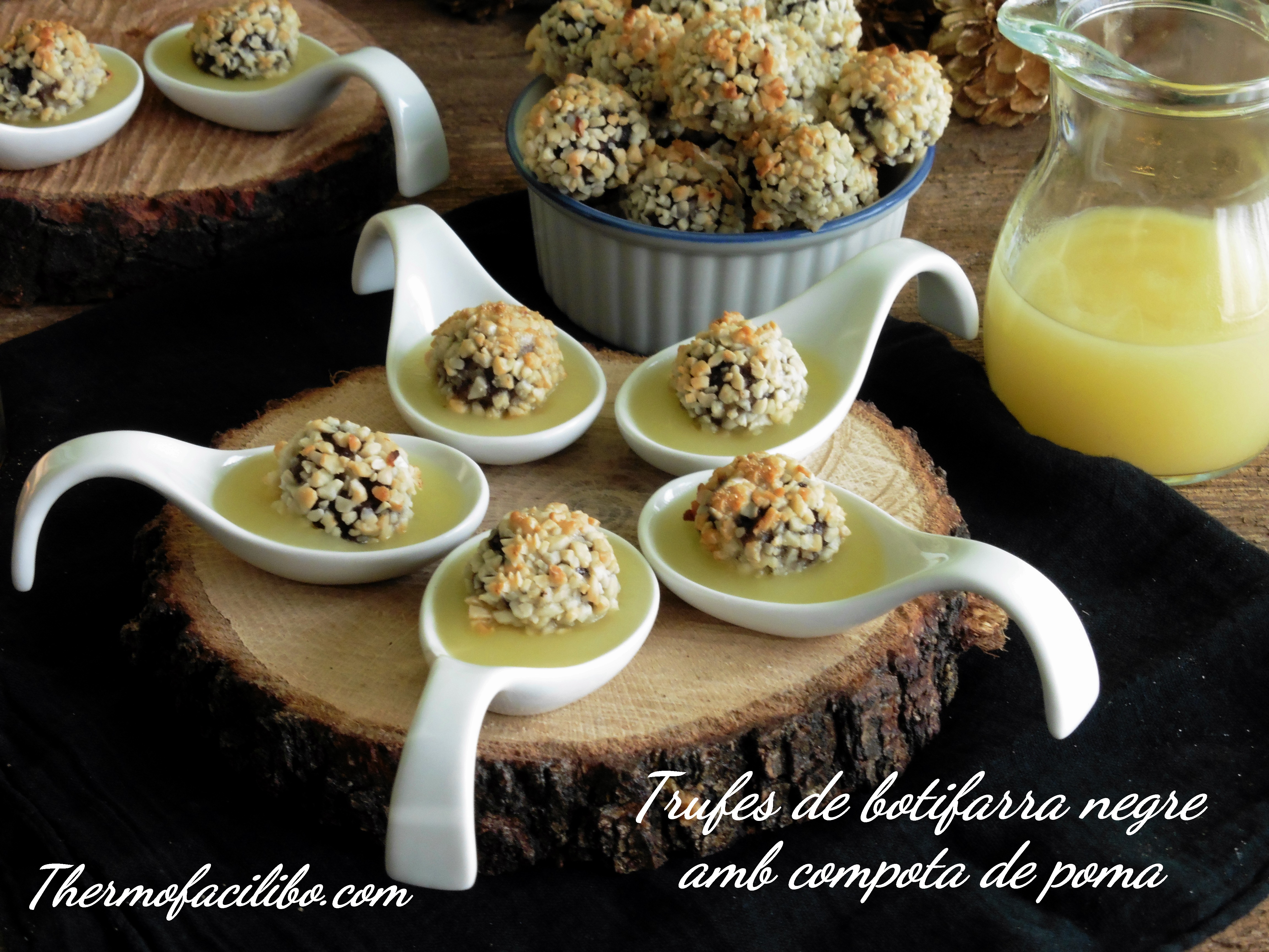 - Repartir el puré de poma en culleres de presentació i col·locar al damunt una trufa de botifarra.