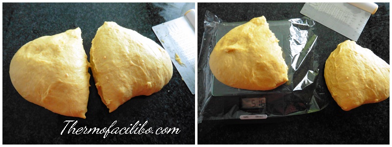 - Aleshores fer una bola pesarà aprox 1’100 kg. Dividir-la en 2 boles, per fer 2 tortells de ½ kg. Tallar la massa sense estirar-la.
