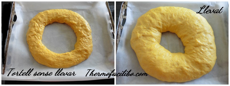 Normalment quan faig la recepta faig dos tortells de ½ kg cadascun, un el farceixo de nata, i l’altre el deixo sense farcir. Però aquesta vegada ho he fet diferent! Us explico; he fet un tortell molt gran, de 700 g, i amb la resta de massa he fet dos tortells petitons. Un amb forat al mig i l’altra sense.