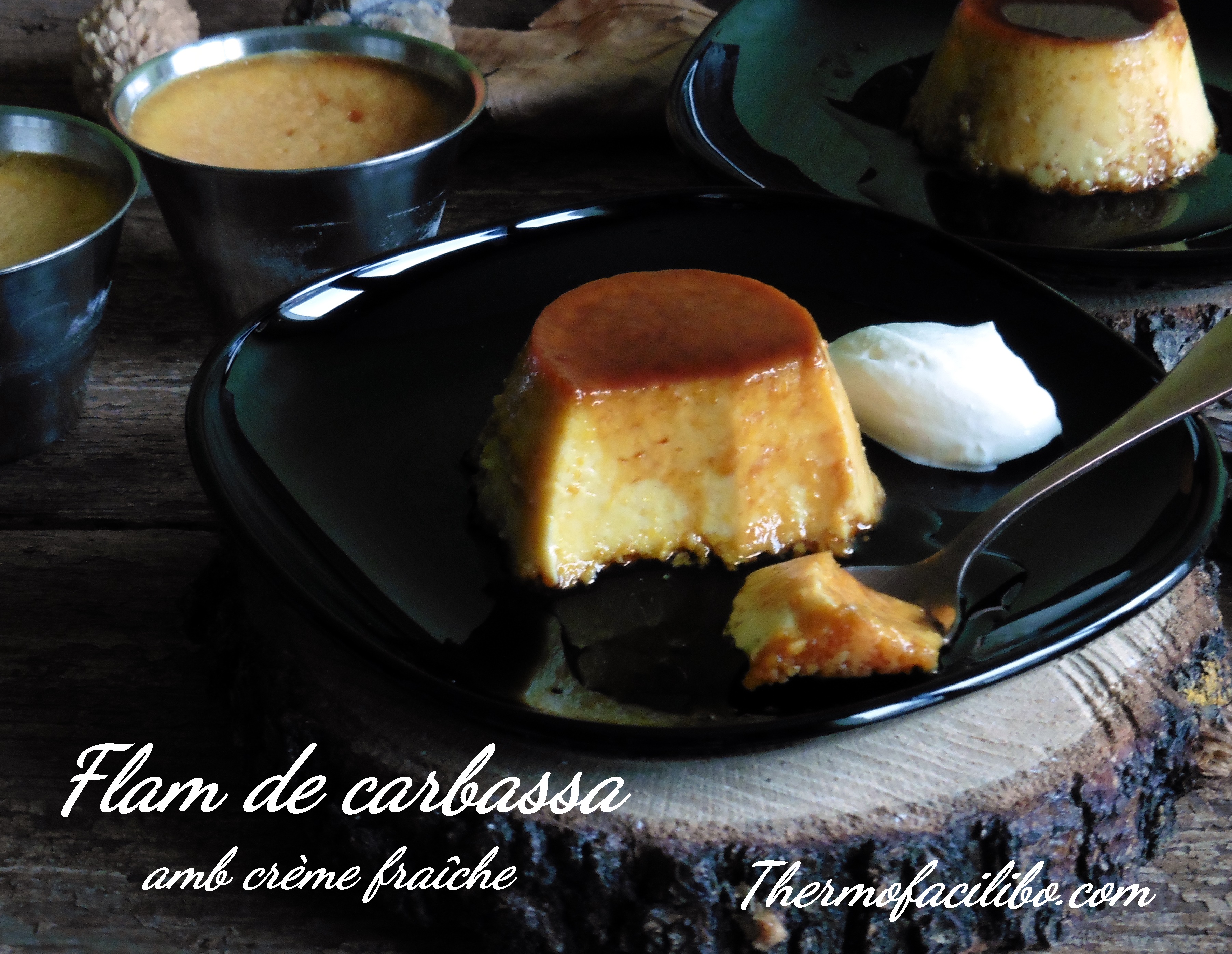 Són uns flams de gust suau, textura finíssima i color espectacular, com tot el que porta carbassa. A mi m’encanten acompanyats d’una quenelle (piloteta allargada, feta amb l’ajut de dues culleres) de crème fraîche. El contrast del sabor dolç dels flams amb l’àcid de la crème, personalment m’agrada moltíssim.