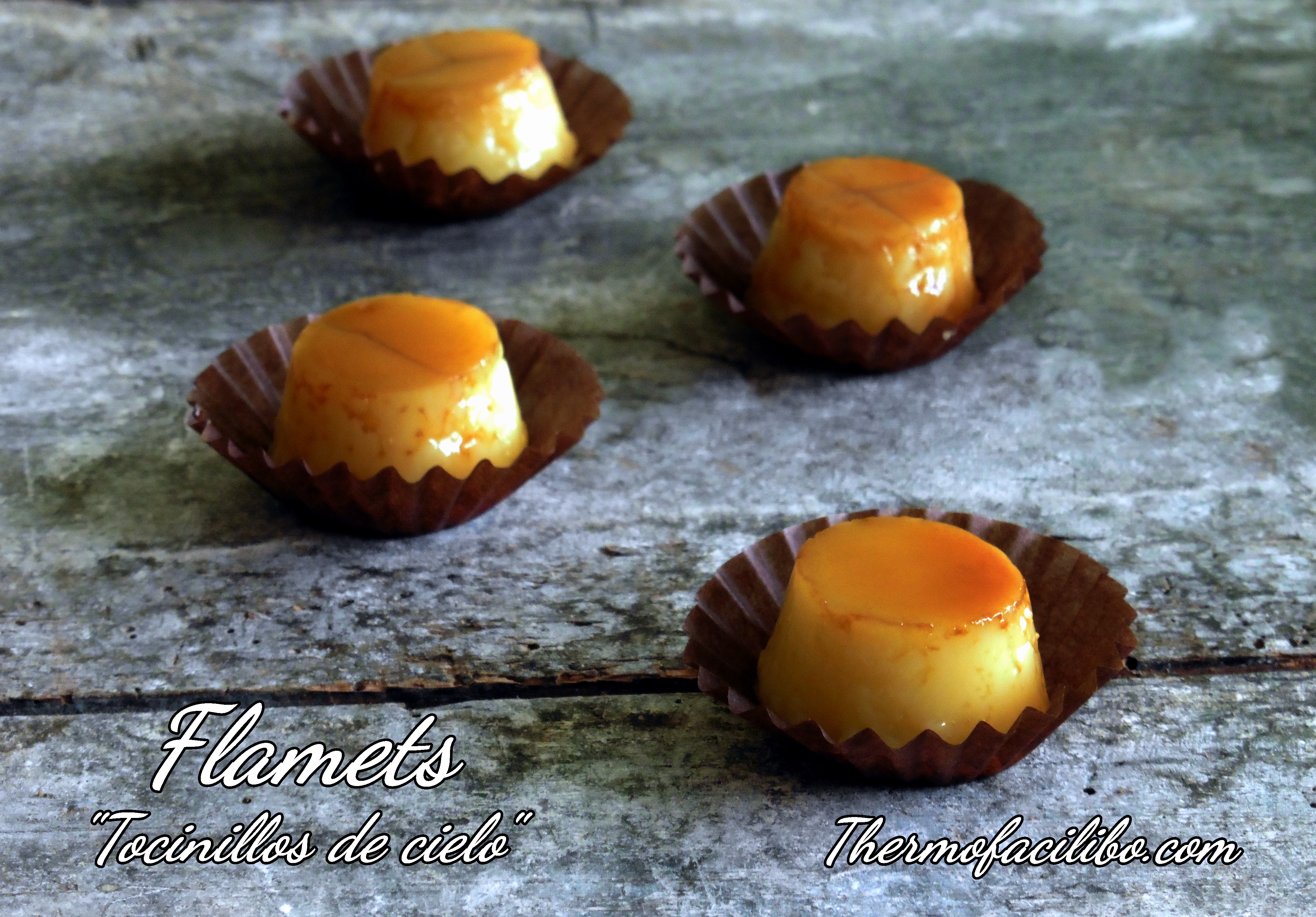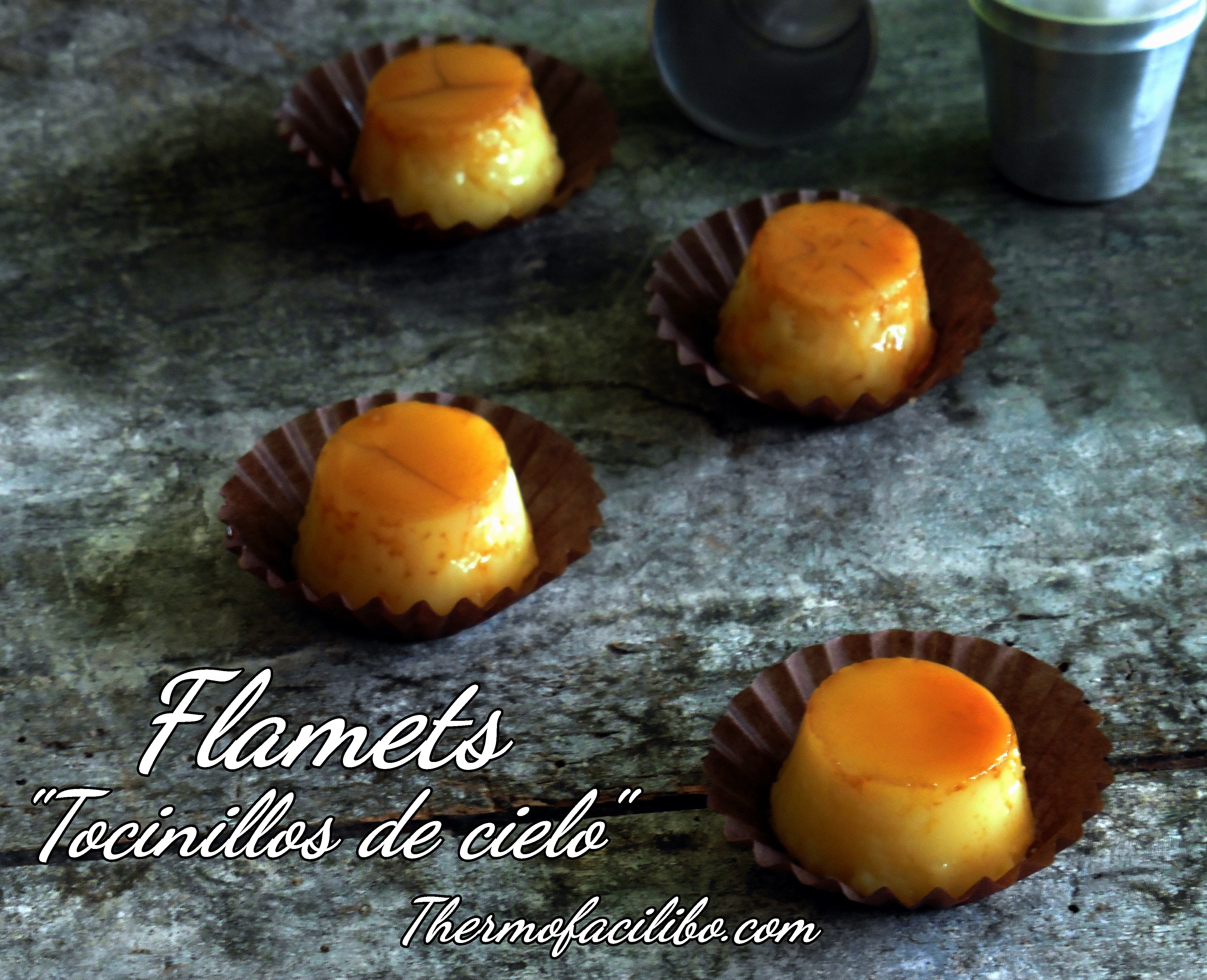 La recepta és del llibre de thermomix Repostería i pasteleria, volum I. Només que en el llibre fan els flamets més grans, per menjar amb cullera. A mi personalment els «tocinets», m’agraden mida mosset, petitons i dins de càpsules de paper, com els he vist sempre a les pastisseries. Per tant, jo els faig en unes flameres metàl·liques minis, especial per a «tocinets».
