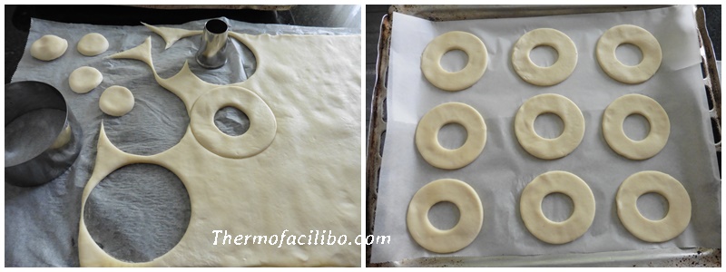 - Amb un cèrcol rodó i la base d’una embocadura de mànega pastissera donar forma a les rosquilles. Anar-les col·locant sobre un parell de safates de forn prèviament folrades amb paper d’enfornar.