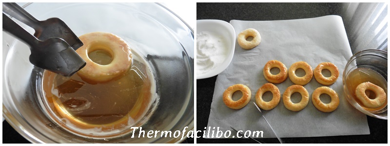 - Treure les rosquilles del forn i deixar temperar. A continuació, introduir-les completament dins el bol de l’almívar, deixar-les escórrer sobre paper de forn i arrebossar-les amb sucre.