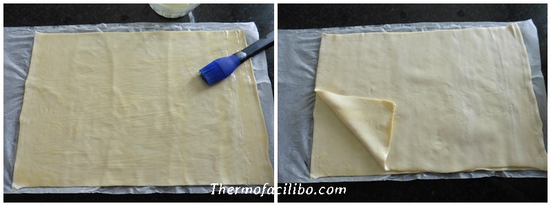 - Desplegar una làmina de pasta de full i pintar-la amb la mantega fosa. Col·locar l’altra làmina al damunt, i amb les mans, pressionar lleugerament a tot el vol i al mig, perquè quedin ben enganxades.