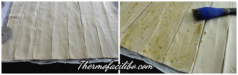 - Estendre la pasta de full sobre paper en què ve enrotllada i tallar 8 tires de 5 cm. Pinzellar amb salsa pesto.