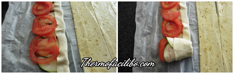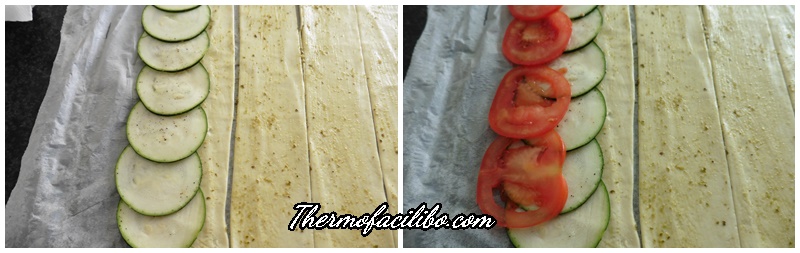- Sobre cada tira de pasta de full i col·locar les rodelles de carbassó, una mica sobreposades, i que surtin una mica de la part superior. A continuació i col·locar les rodelles de tomàquet.