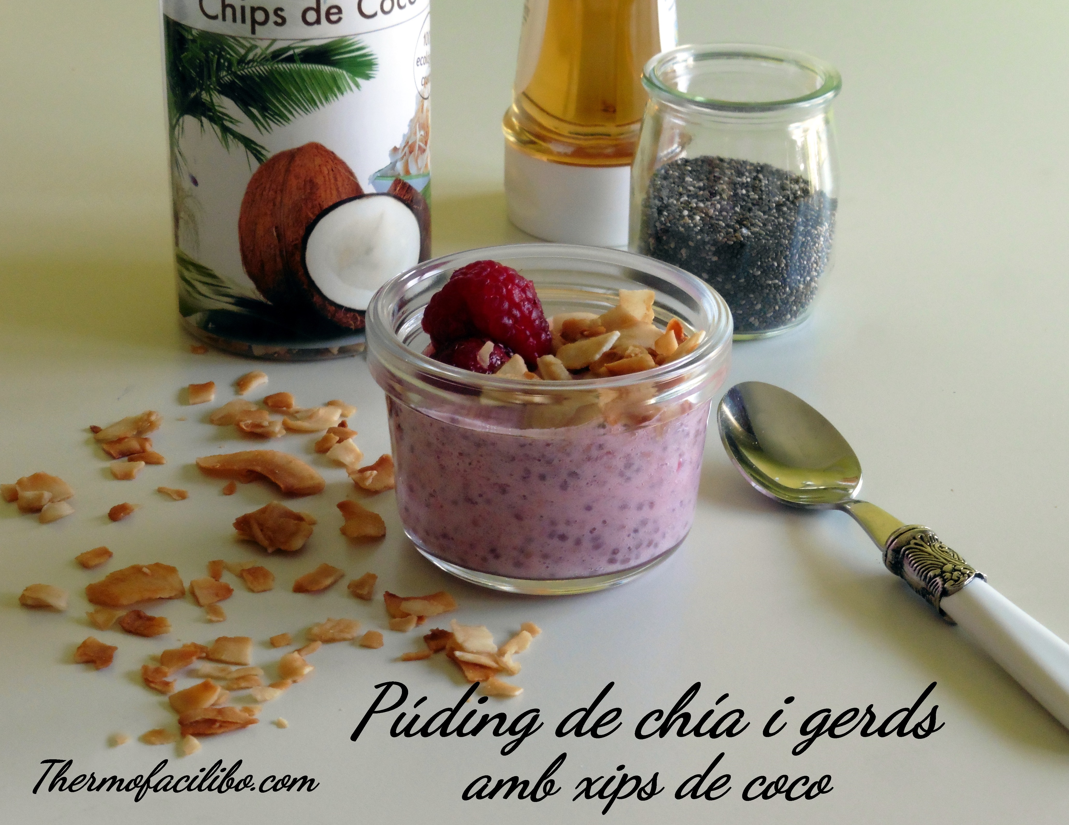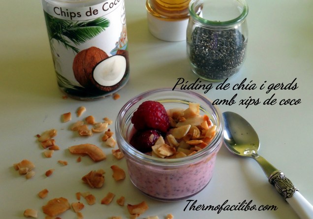 Doncs bé, anem a la recepta… Aquest tipus de púdings admeten mil combinacions diferents fàcilment adaptables al nostre gust. Avui l’he fet amb gerds.….El meu l’he acompanyat amb xips de coco, en canvi el meu marit ha escollit acompanyar-lo amb perles de xocolata. I vosaltres, amb què preferiu acompanyar-lo???