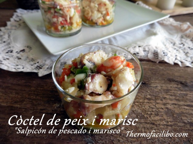Ahir al vespre vaig preparar aquest còctel de peix i marisc per tenir-lo avui per dinar. És una recepta senzillíssima, això sí, un xic entretinguda perquè s’han d’anar trossejant tots els ingredients. Però el resultat….. Val moooolt, moooolt la pena. Us ho asseguro!!!!