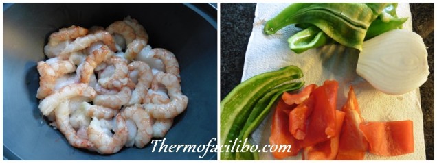 - Salpebrar els daus de rap i col·locar-los ben repartits en el recipient varoma. Pelar els llagostins i col·locar-los al damunt del rap. Tapar el varoma i reservar.