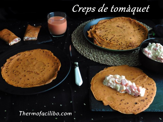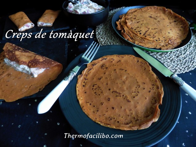 Sí, avui creps de tomàquet!!! Les he farcit amb una barreja de formatge cremós, tomàquet, cogombre, pebrot (tot tallat petitó) i bastonets de cranc. Però tan sols acompanyades amb un bon pernil ibèric i una amanida, són genials pels sopars informals d’estiu.