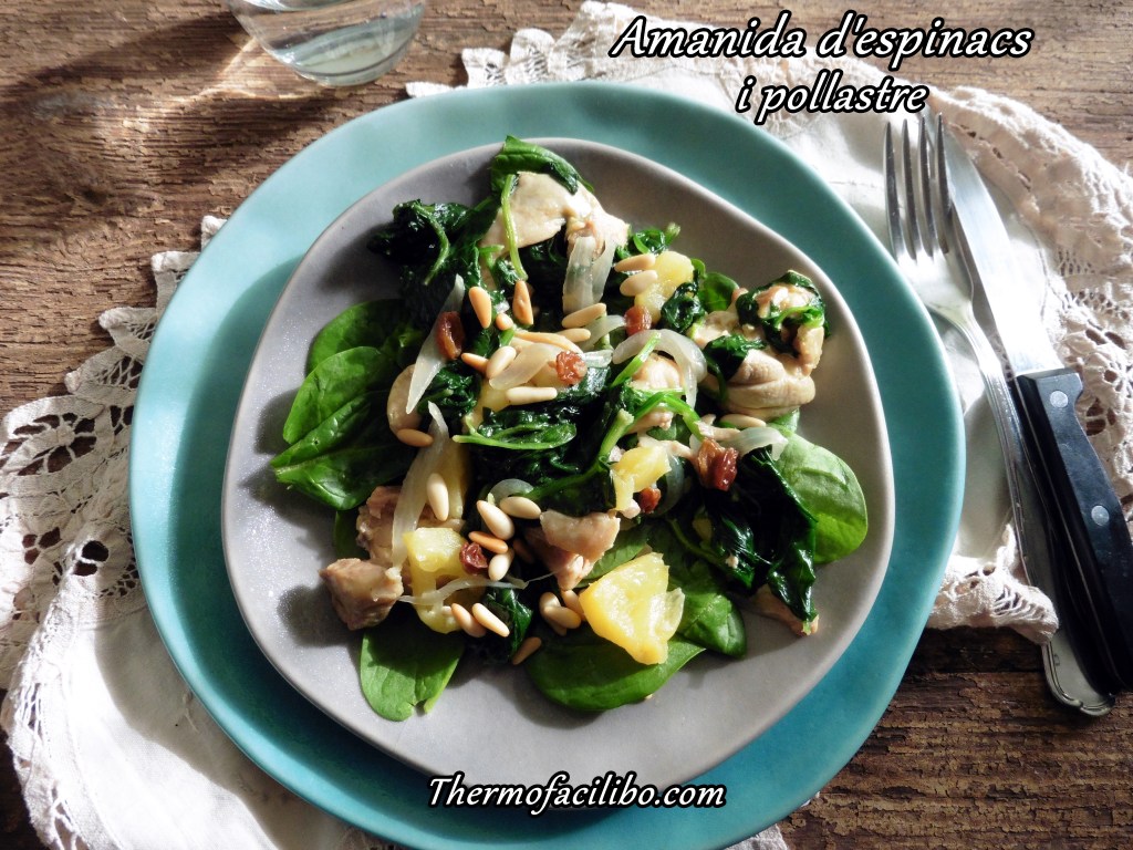 Avui he fet aquesta amb espinac fresc, panses, pinyons, poma i pollastre. Una amanida tèbia boníssima, a més de completa i molt lleugera. Què us sembla??? A nosaltres ens encanta!!! Espero que a vosaltres també!!