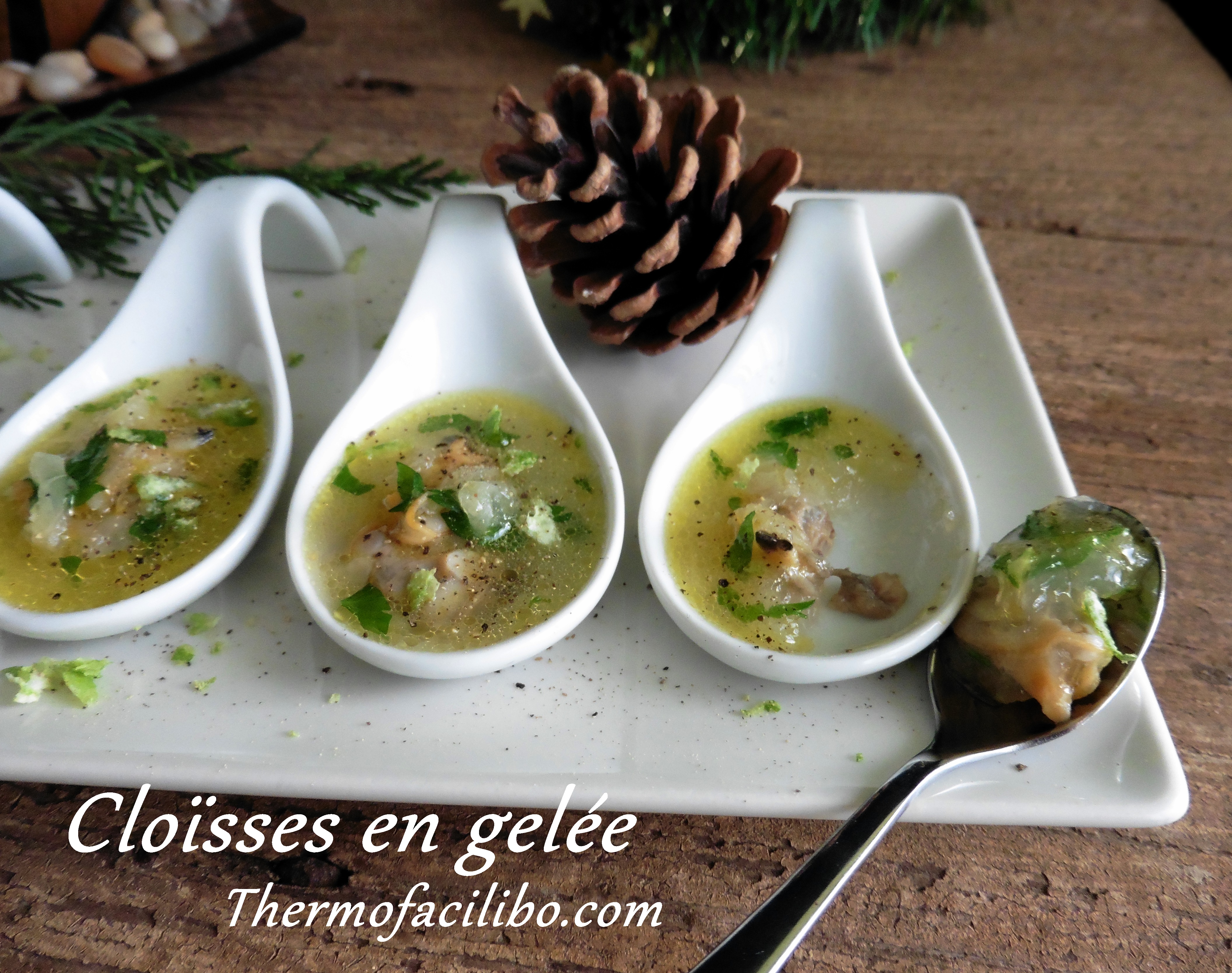 Amb la meva cunyada estem acabant d’enllestir la taula i alguns dels aperitius que hem deixat per l’últim moment. Just ara, hem tret de la nevera aquestes cloïsses en gelée, i les acabem d’empolvorar amb uns polsims de pebre i pell de llima ratllada. M’encanta aquest aperitiu!!!! Són cloïsses dins d’una salsa gelatinosa de ceba, all, vi blanc i julivert, que van servides dins de petites culleretes de presentació. Són uns mossets lleugers i molt refrescants. A més, aquest aperitiu es prepara amb antelació, i en l’últim moment, només cal donar el toc final amb la llima i el pebre.