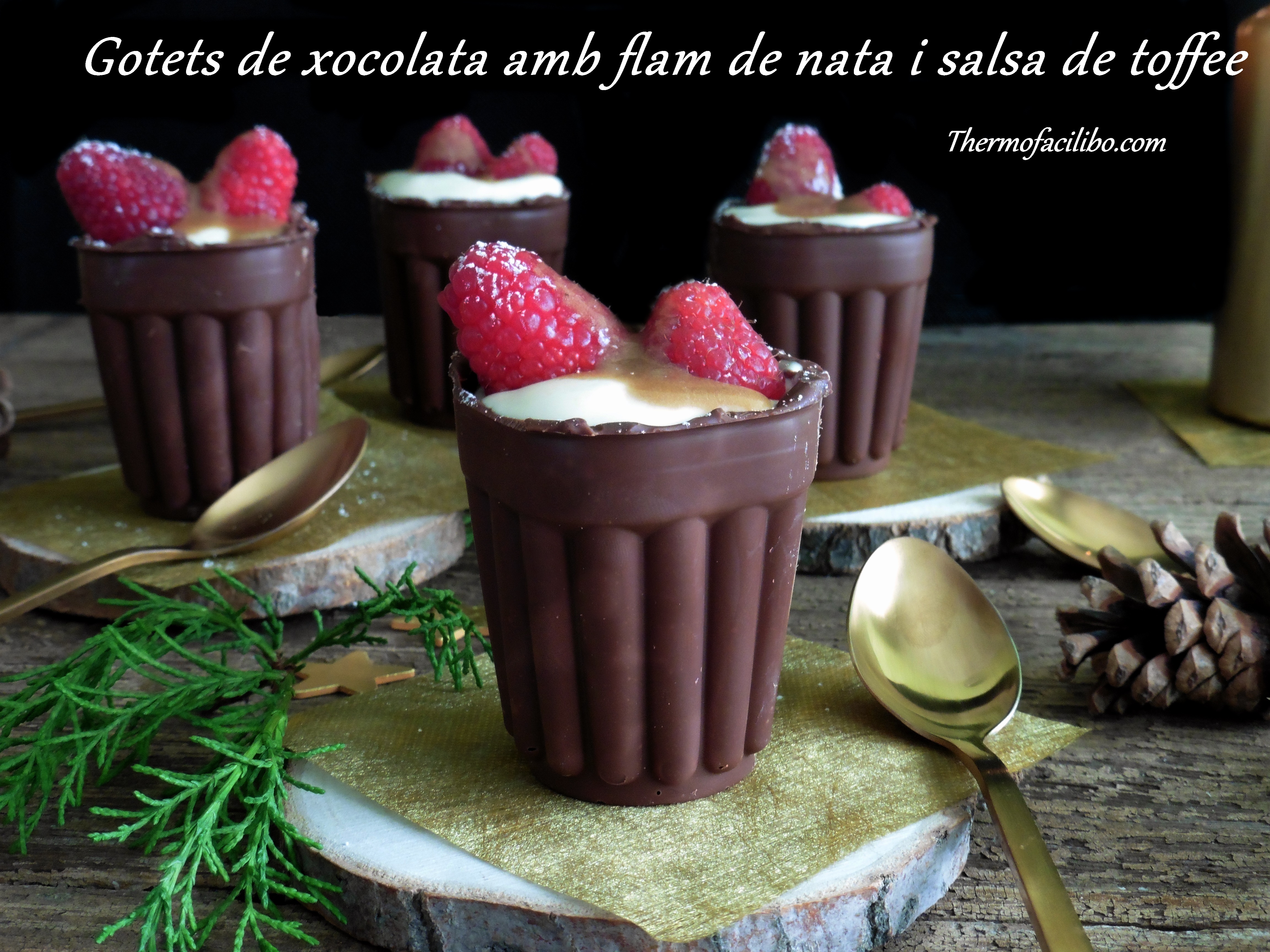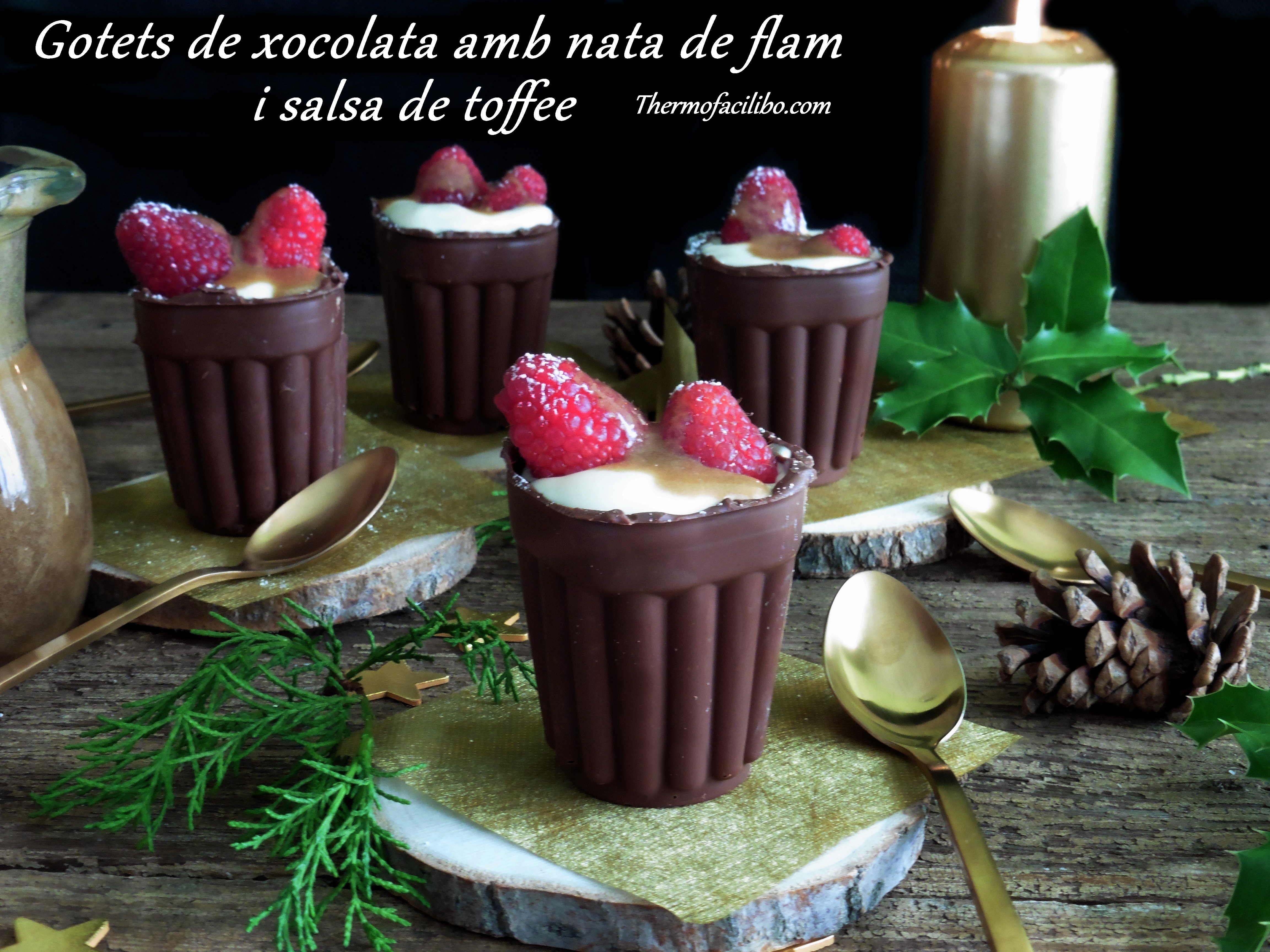 Nota: De flam de nata i salsa toffee en sobrarà. Jo el que faig, és servir-ho a la taula dins de gerretes o salseres i així tothom que vulgui pot repetir reomplint-se el gotet de xocolata.