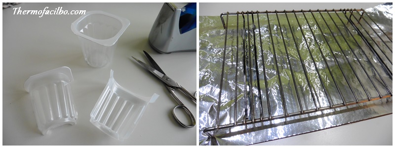 - Rentar els recipients dels flams i eixugar-los bé. Amb unes tisores partir-los per la meitat longitudinalment de manera que quedin en dues parts. Tot seguit enganxar-los amb celo per formar de nou el recipient. Reservar.
