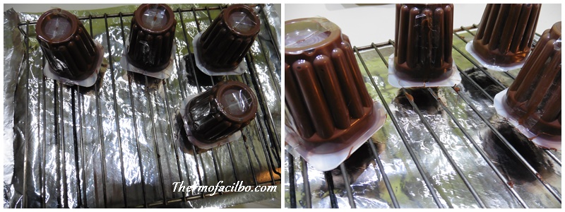 - Repartir la xocolata dins dels recipients dels flams. Amb l’ajut d’una culleradeta, cobrir i repartir bé la xocolata per les parets i la base dels recipients. Col·locar-los cap per avall en una reixeta posada sobre paper de plata o una safata. Reservar al congelador. Jo els deixo d’un dia per altre.