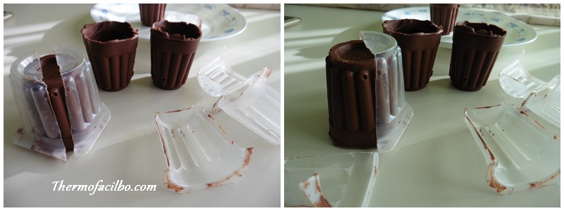 - Retirar els recipients dels flams del congelador. Amb compte de no trencar-los, desenganxar el celo, separar les dues parts de plàstic i col·locar el motlle de xocolata dins un plat. Repetir el procés amb la resta de recipients.