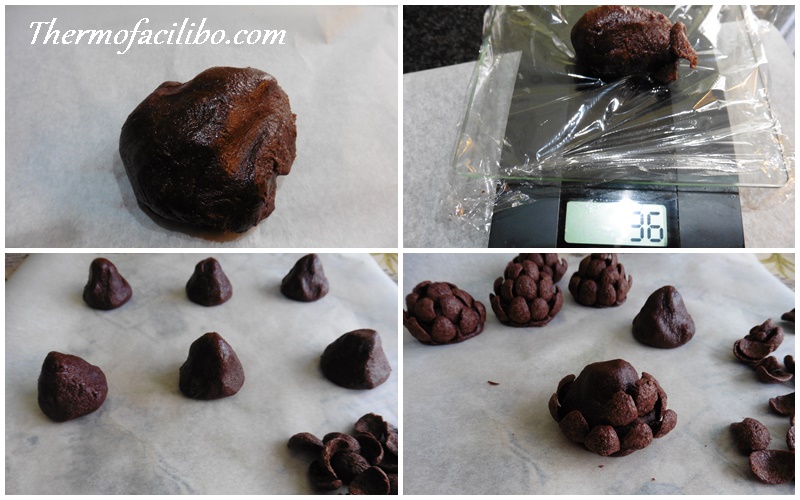 - Dividir la massa en porcions de 35 g aprox. Donar-los forma de cono i començant per la base, anar enganxant el cereals formant files, fins a completar el cono.