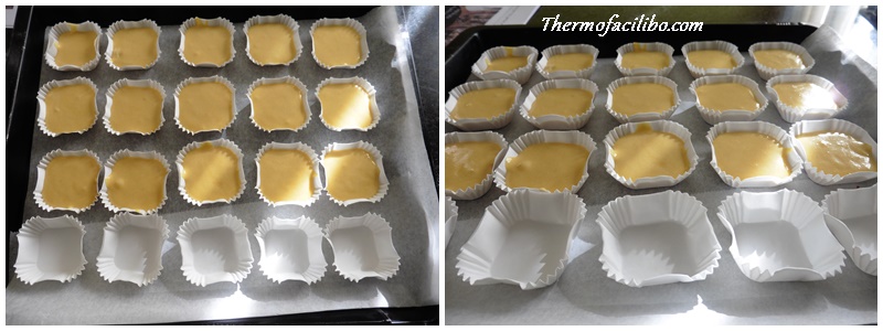 Nota: Jo les he fet dins de càpsules de paper quadrades que són les típiques de les marqueses, però es poden fer dins de càpsules de paper per a magdalenes (rodones). Si la càpsula de paper és molt fina, perquè aguanti la forma en omplir amb la massa, millor posar-les dins un motlle rígid (de porcions de brownie si les feu quadrades, o de magdalenes, si les feu rodones. O bé, utilitzar més d'una càpsula de paper per cada marquesa (un parell o tres l' una dins l'altre) així quedarà més gruixuda i aguantarà bé el pes de la massa. D'aquesta última manera és com ho he fet jo. Fixeu-vos en la foto de la preparació. He folrat una safata de forn amb paper vegetal i he col.locat les càpsules de paper al damunt (tres per marquesa, perquè eren càpsules molt finetes) en sortir de forn he retirat les dues càpsules sobrants de cada marquesa.