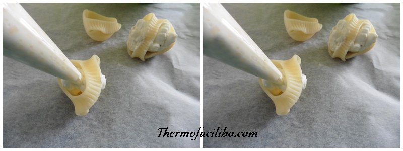 - Posar els formatges dins el got i barrejar 30 segons a velocitat 5. Posar la crema dins una mànega pastissera d’embocadura fina i farcir els galets. Reservar.