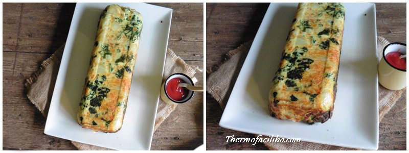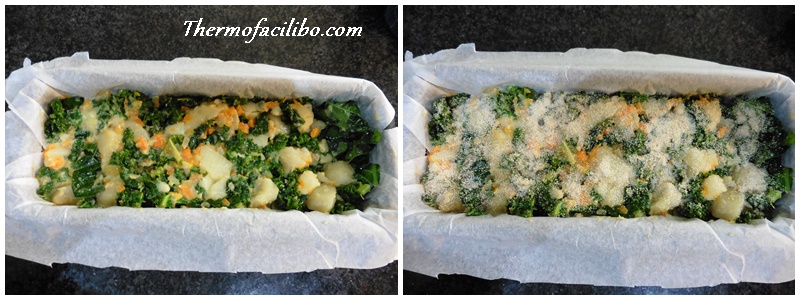 - Afegir dins el got els ous i 1 culleradeta de sal. Batre 30 segons, gir invers i velocitat 4. Abocar sobre el kale i les patates i barrejar amb l’espàtula. Abocar la mescla en el motlle reservat i empolvorar la superfície amb el pa ratllat.