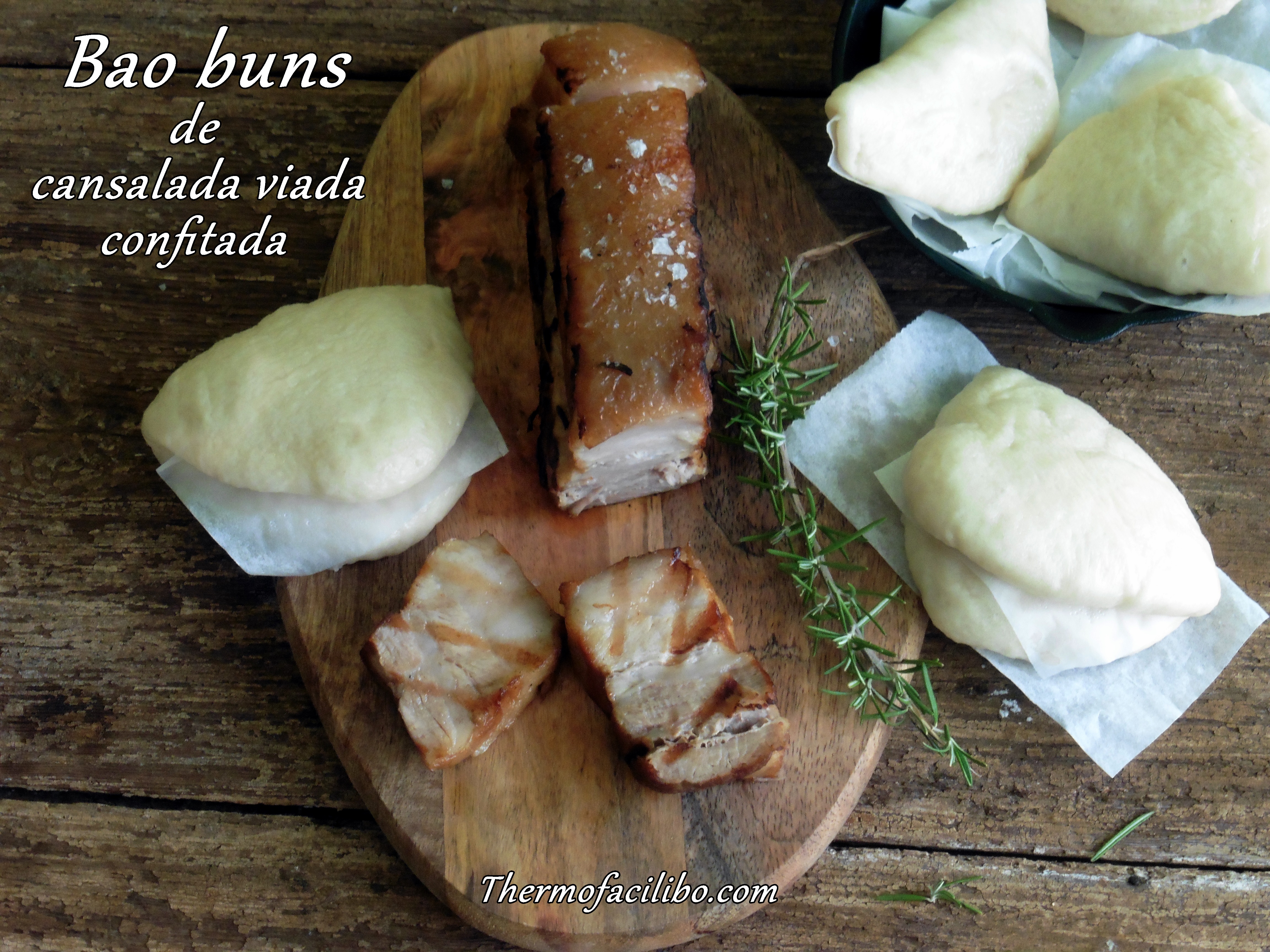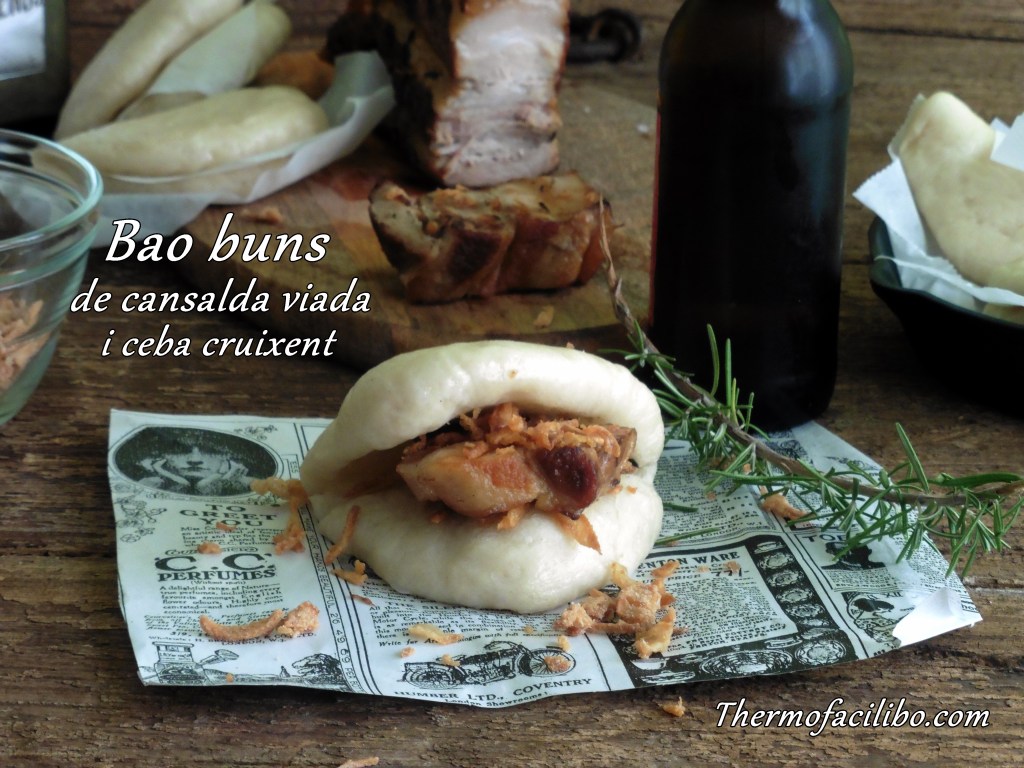- Obrir el baos, retirar el paper vegetal i posar un tros de cansalada viada, unes gotes de salsa hoisin (jo, sal Maldon), un grapat de ceba cruixent i algunes fulles de ruca. Servir immediatament.