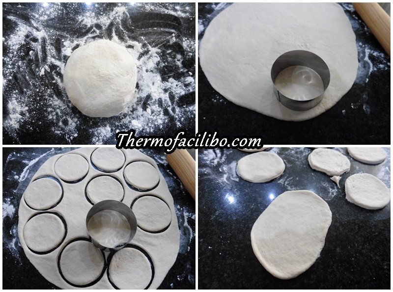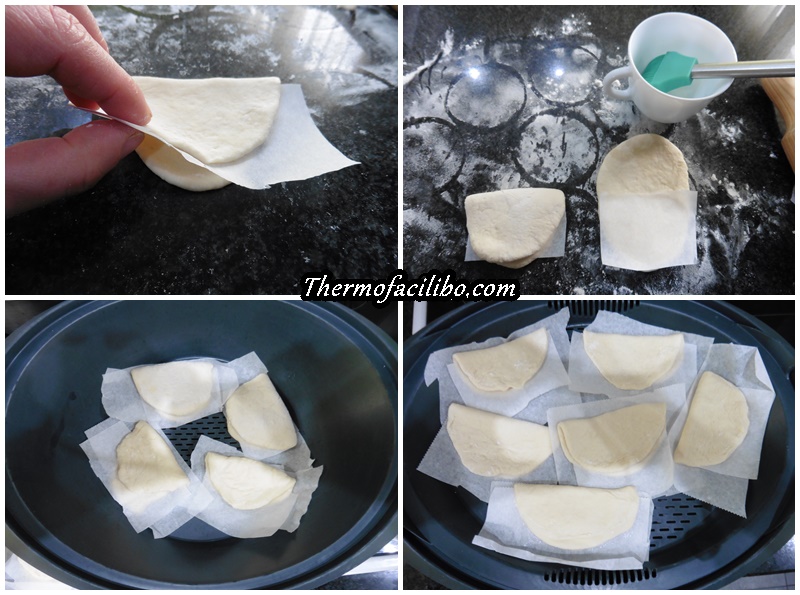 - Abocar la massa en una superfície enfarinada i formar una bola. Amb corró de cuina fer un cercle gran d’uns 8mm. de gruix i amb un aro, tallar cercles de 8-10 cm de diàmetre. Amb el corró, estirar cada cercle fins a donar-los forma allargada. Pinzellar amb oli la meitat de la superfície d’aquestes peces allargades i posar un tros de paper vegetal sobre la part untada amb oli (per separar la massa)Doblegar la massa per la meitat. Col.locar cada bao sobre un tros de paper vegetal i repartir 4 unitats en la safata varoma i 6, en la bandeja varoma. Deixar reposar 30 minuts o fins que hagin doblat el volum.