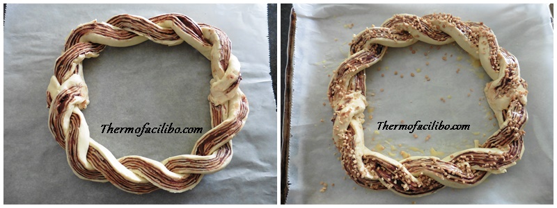 - Amb cadascuna de les parts trenandes doblar-les formant mitja circumferencia i unir els dos extrems per donar formar al niu. Pintar amb ou batut i espolvorejar generosament amb el crocanti d’ametlla.
