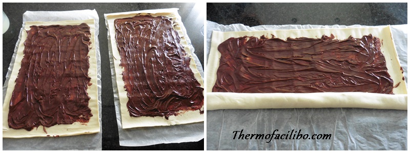 - Desenrotllar les làmines de pasta de full i cobrir-les amb la crema de xocolata. Enrotllar-les sobre si mateixes per la part més llarga per formar un rul·lo
