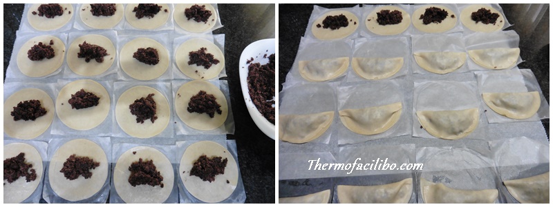 4. Posar una cullerada de botifarra amb ceba caramel·litzada al mig de cada oblea, pinzellar el vol amb aigua i tancar i sellar amb una forquilla, perquè no s’obrin durant el fregit.