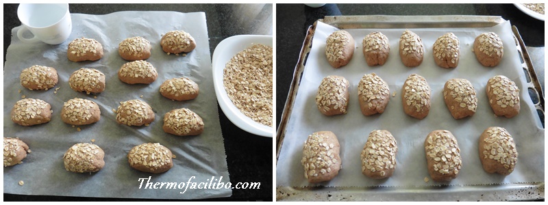- Posar els flocs de civada en un plat. Dividir la massa en 14-15 porcions de 60-70 g cadascuna. Formar una bola amb cada porció i després donar-li una forma un pelín allargada. Pinzellar la part superior dels panets amb aigua i pasar-los pels flocs de civada (perquè quedin enganxats). Col·locar els panets en una safata de forn prèviament folrada amb paper de forn.