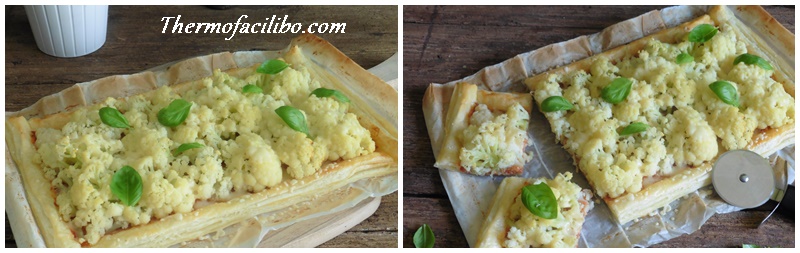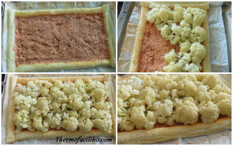 - Sense rentar el got posar-hi els tomàquets secs i el formatge de cabra. Trossejar 3 segons a velocitat 7. Abocar aquesta pasta sobre la pasta de full preenfornada i repartir-la uniformement. Al damunt, col·locar-hi els ramells de coliflor cuits, i per últim, repartir el formatge emmental ratllat.