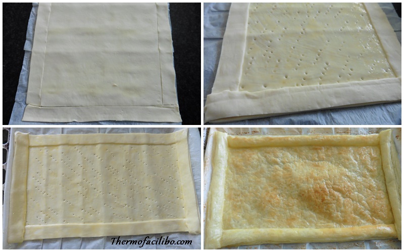 - Mentrestant, estendre la làmina de pasta de full i tallar 2 tires de massa de 2cm. d’ample a tot el llarg i unes altre 2 tires de 2 cm. a l’ample. Punxar la superfície de la massa amb una forquilla, pinzellar amb ou batut i enganxar a sobre les tires que hem tallat (com si fos un marc de fotos). Pinzellar també amb ou les tires de pasta de full. Enfornar durant 10 minuts a 200º. Retirar del forn i reservar.