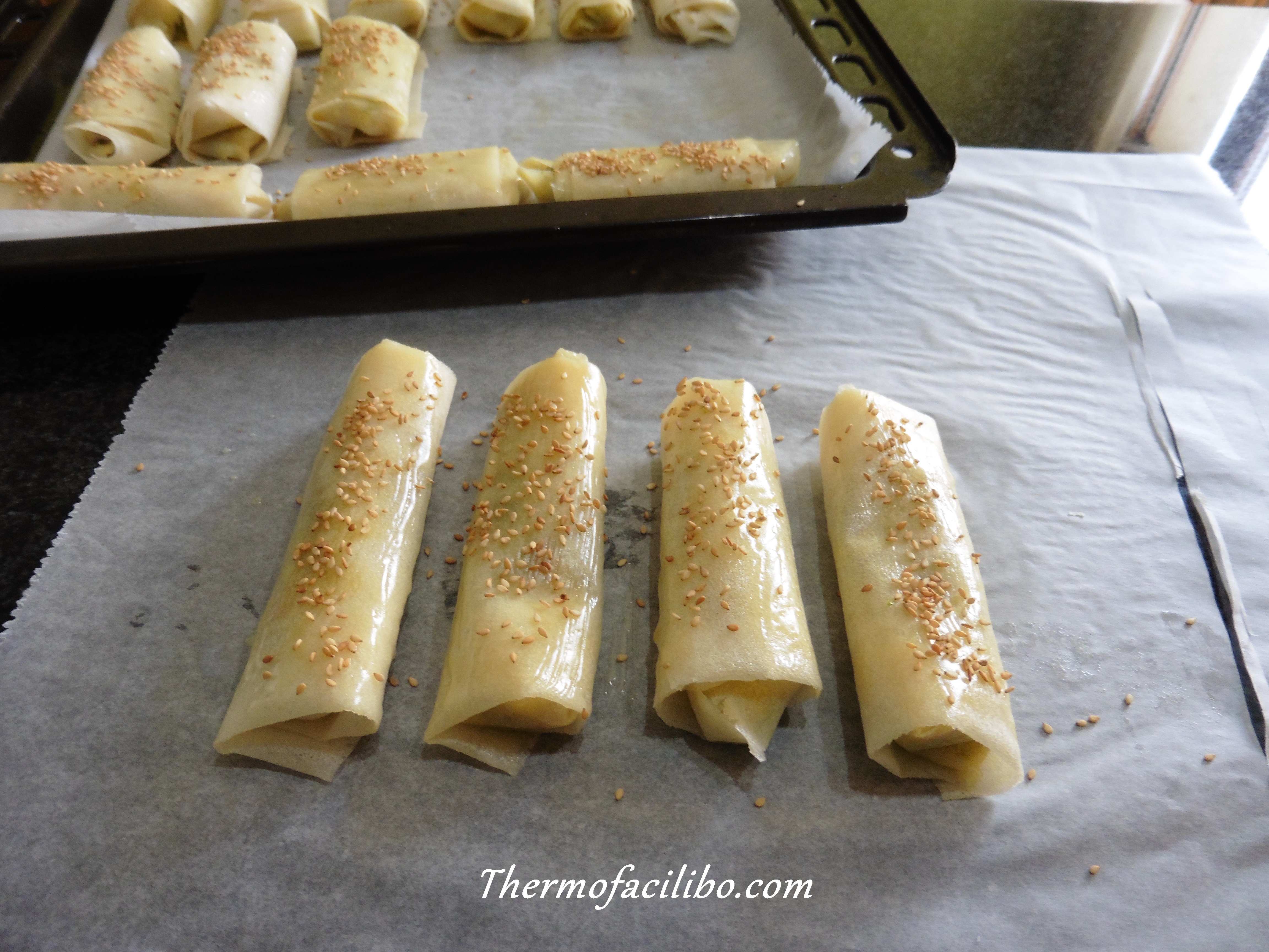 - Col·locar els rotlles en una safata de forn prèviament folrada amb paper vegetal. Pinzellar els rotllets amb mantega i empolvorar amb sèsam torrat pel damunt.