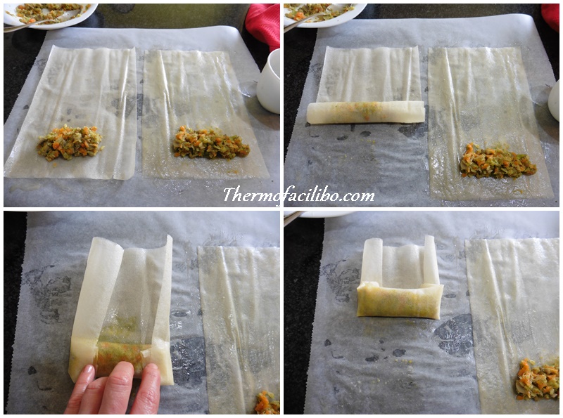 - Pinzellar cada làmina de pasta filo amb mantega fosa i posar al centre, de l’extrem més proper a nosaltres, una cullerada de les verdures. Enrotllar fins a la meitat, aleshores, doblar els laterals cap al centre i acabar d’enrotllar (com us mostro a les fotos).