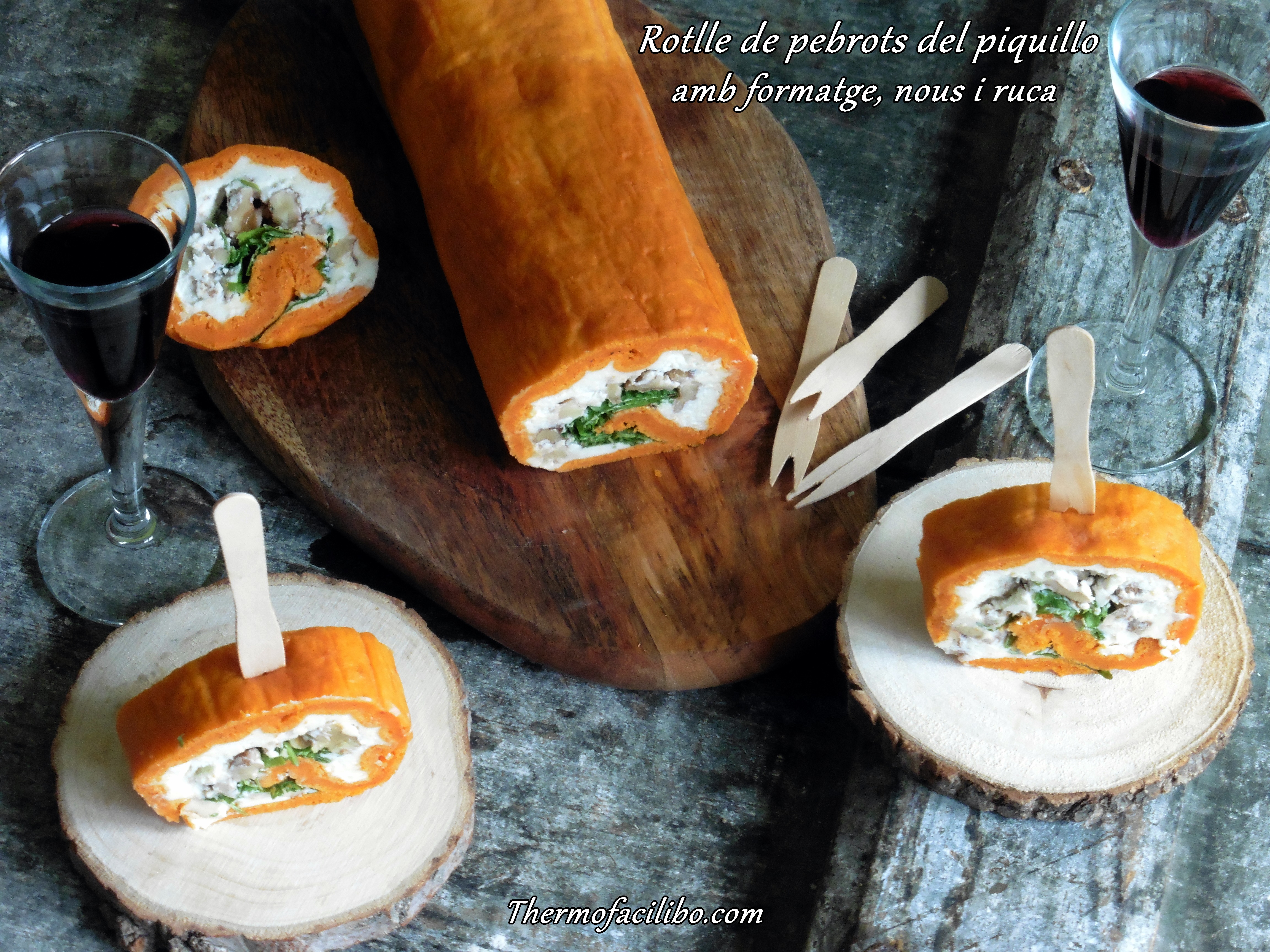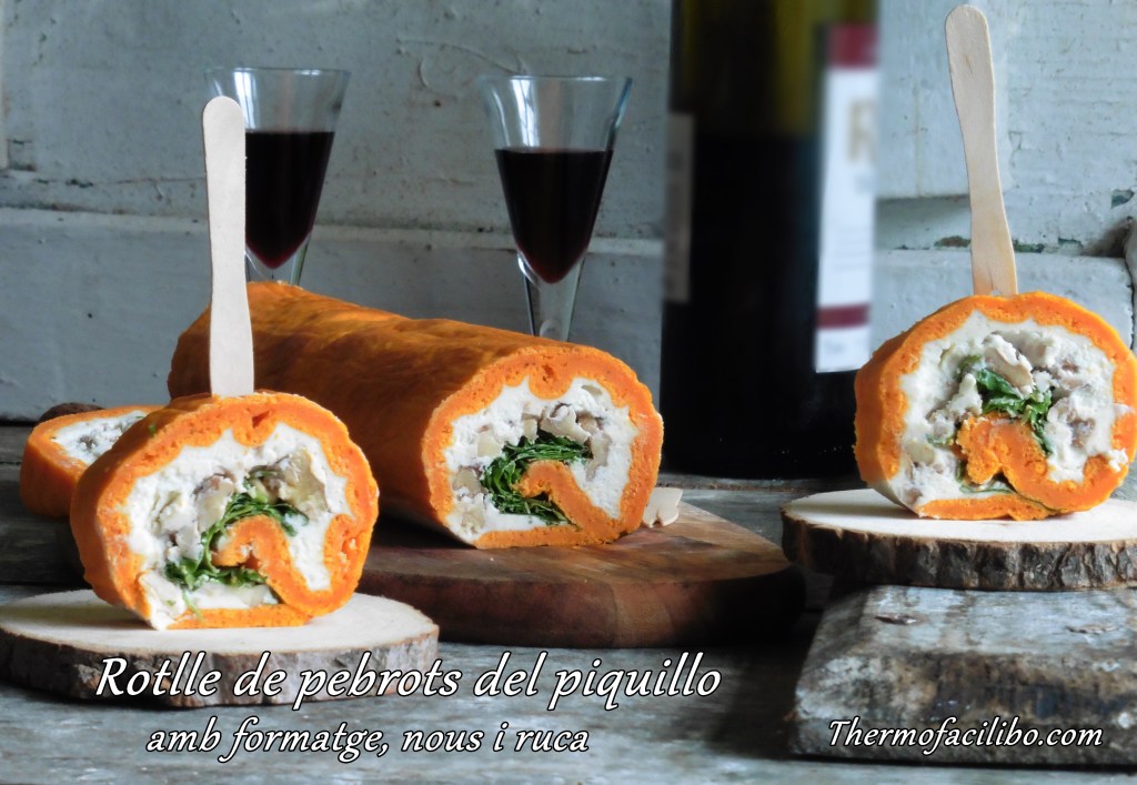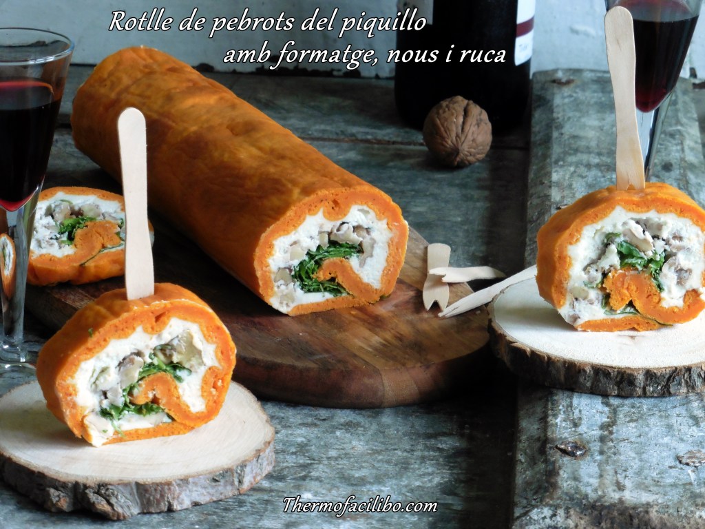 Es tracta d’una planxa de pa de pessic feta amb pebrots del piquillo, d’aquí aquest color tan viu i atractiu que té. El farcit és a base de formatge de cabra i Philadelphia, però es pot canviar per roquefort, gorgonzola o simplement formatge d’untar natural o de gust suau. El toc verd li donen les fulles de ruca, que també es poden canviar per espinacs baby. I no em puc oblidar del punt cruixent que li aporten els fruits secs, en el cas d’avui les nous…. Li van genial.