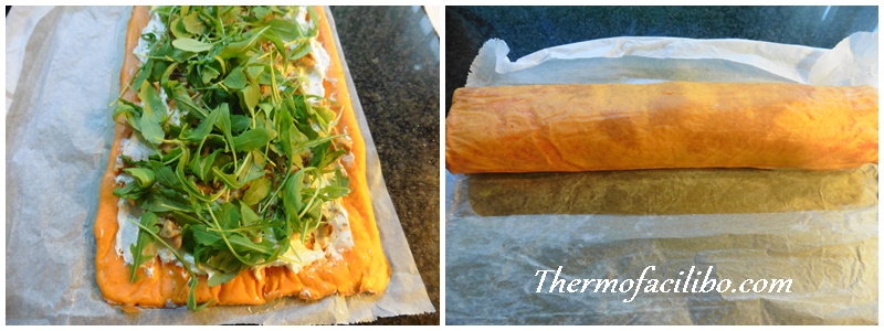 - Desenrotllar el pa de pessic (amb compte que no es trenqui) i amb el dors d’una cullera estendre la barreja de formatges per tota la superfície, deixant 1 cm lliure a tot el vol. Al damunt, repartir les nous i la ruca i tornar a enrotllar amb l’ajut del paper, fent una mica de pressió perquè quedi compacte. Embolicar amb film transparent i reservar dins la nevera un mínim de 3-4 hores. Millor d’un dia per altre.