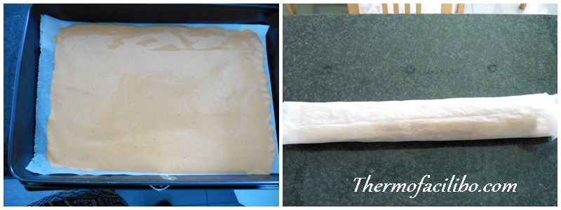 - Retirar del forn i en calent enrotllar el pa de pessic juntament amb el paper, per la part més llarga. Embolicar amb un drap i deixar refredar durant aproximadament 1 hora.