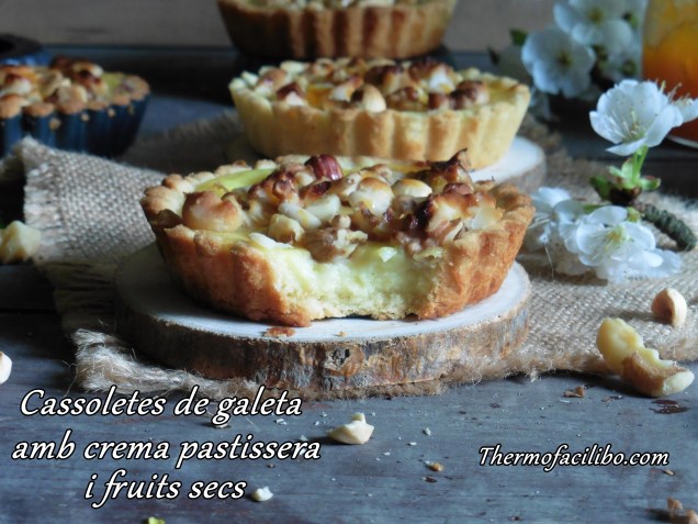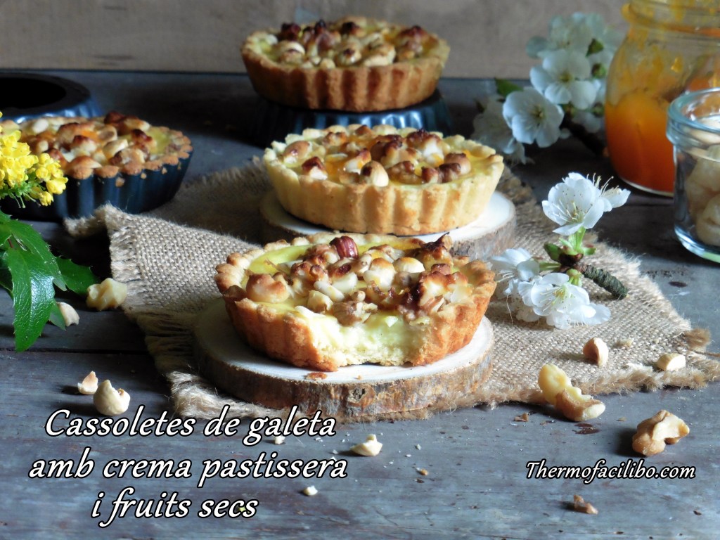 És una recepta molt fàcil i té l’avantatge que es pot preparar la massa de galeta i la crema pastissera el dia anterior, això és genial per treure’ns feina de sobre. Una altra cosa a tenir en compte és que a mi m’agrada utilitzar cassoletes individuals, però es pot fer en un motlle més gran i presentar-ho en format pastís.