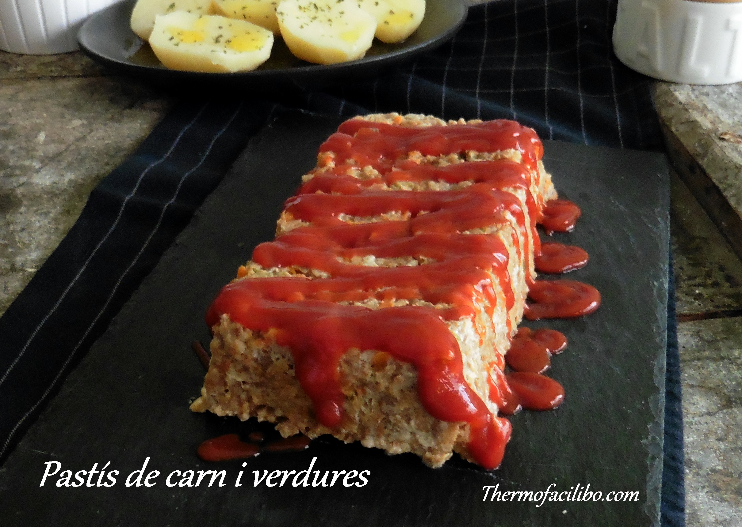 Una de les coses que més m’agrada del thermomix són els seus diferents nivells de cocció. Com en la recepta d’avui, que mentre fem el pastís de carn i verdures en el recipient varoma, podem aprofitar i posar quelcom dins el got. Avui, unes patates per l’acompanyament del plat. Genial, oi??